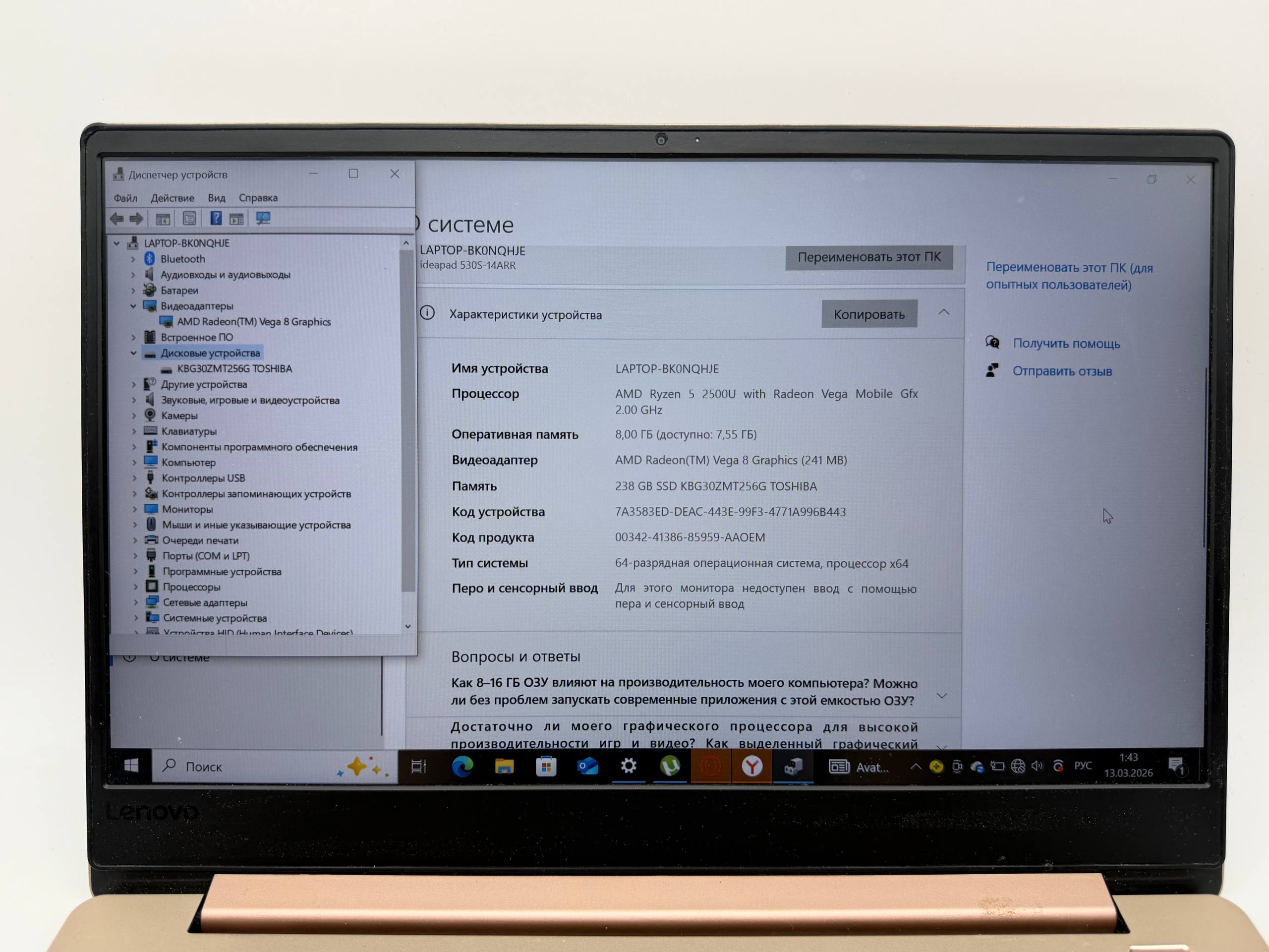 Lenovo IdeaPad 530S-14ARR 81H1 AMD Ryzen 5 2500U with Radeon Vega Mobile Gfx 2.00 GHz